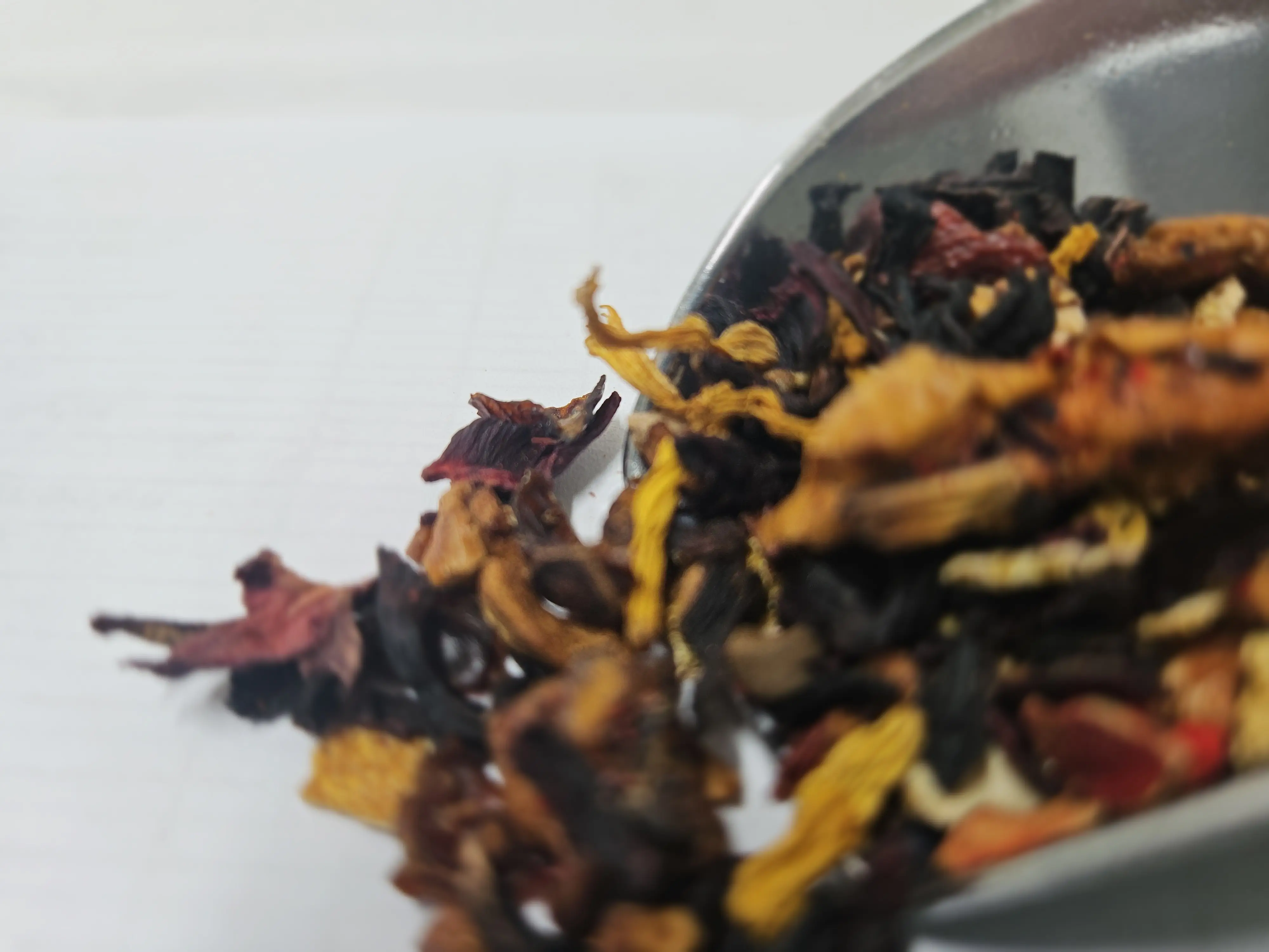 Zutaten: Hibiskusblüten, Apfel, Hagebuttenschalen, Ananas (Zucker, Ananas, Zitronensäure E330), Orangenschalen, Sonnenblumenblüten, Aroma