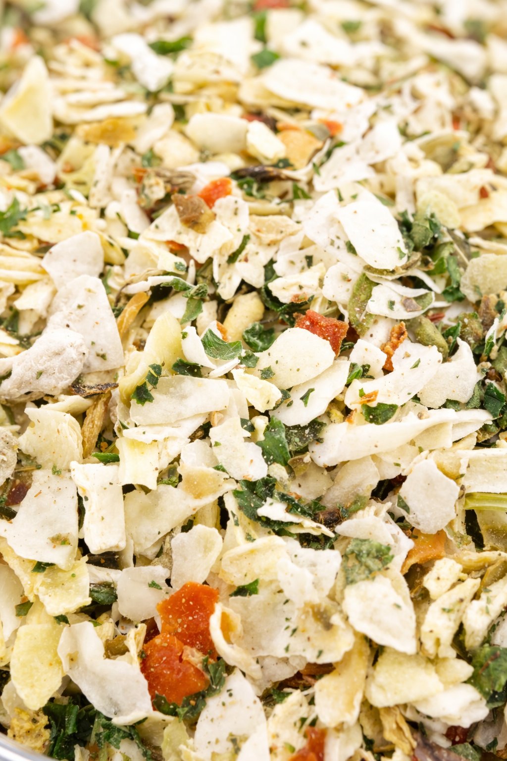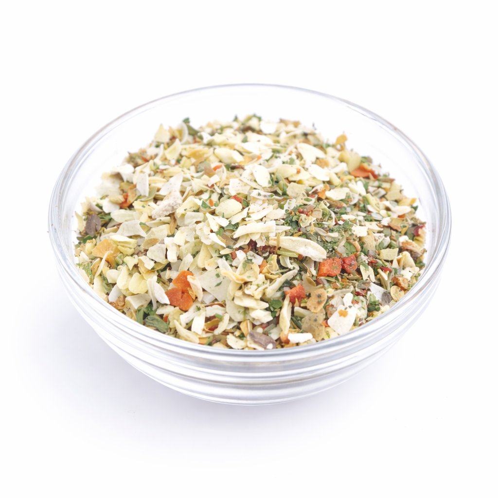 Zutaten: Zwiebel, Meersalz (10 %), Petersilie, Suppengewürzmischung (Karotten, Pastinaken, Petersilie, Schnittlauch, Sellerie), Knoblauch, Oregano, Rohrzucker, Paprika.